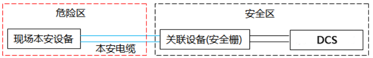 本质安 全防爆系统简称本安回路系统,由三部分组成:现场本安设备、本安电缆及关联设备,如图1所示。系统回路以安 全栅为界分为本质安 全电路和非本质安 全电路。从安 全栅通过本安电缆连接到现场仪表所构成的电路为本安电路;从安 全栅到DCS以及到供电电源的电路为非本安回路。
