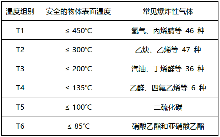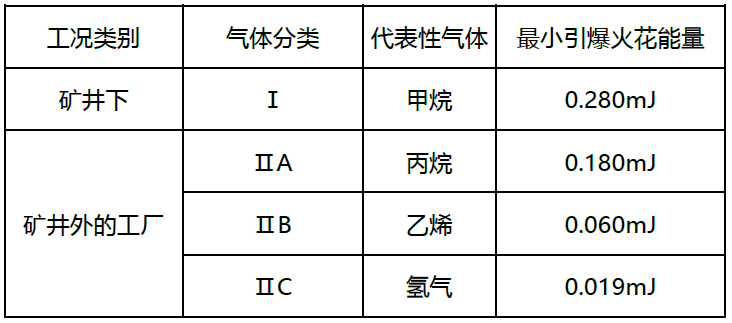 根据可能引爆的zui小火花能量,我国和欧洲及世界上大部分国家和地区将爆 炸性气体分为四个危险等级 , 如下表 :