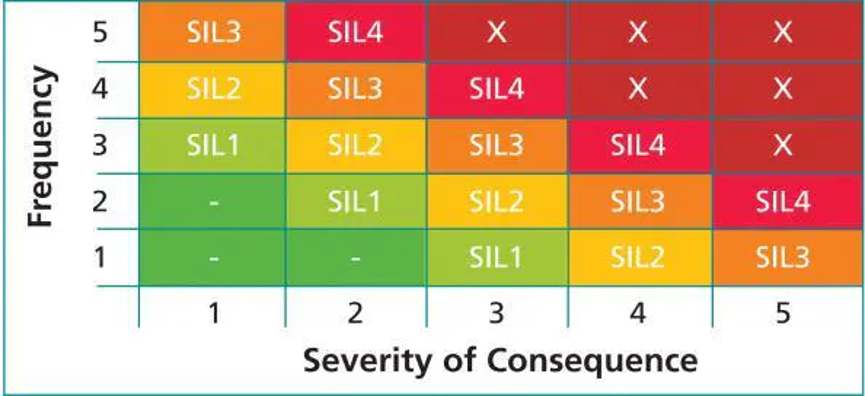 根据IEC标准的定义,有四个SIL级别(1-4)。 较高的SIL水平意味着更大的过程危害和SIS所需的更高级别的保护。 概括如何确定SIL水平,参见图1。SIL水平是危险频率和危害严重程度的函数。 可能更频繁发生或具有更严重后果的危险将具有更高的SIL水平。
